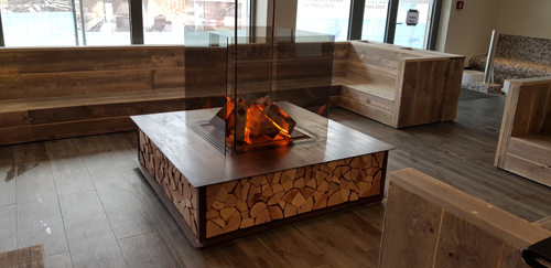 my-flame plant, fertigt, liefert und montiert eine frei im Raum stehende Feuerstelle mit Sitzgelegenheit und mittig flackernden Effektfeuerflammen aus Wasserdampf.
