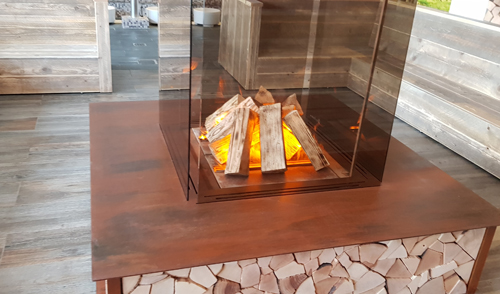 Das aus modernem Cortenstahl gefertigte Flammenmöbel hat eine Oberfläche aus versiegeltem Edelrost. Die Seiten sind mit Echtholzdekor belegt.