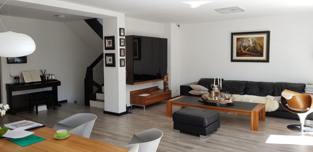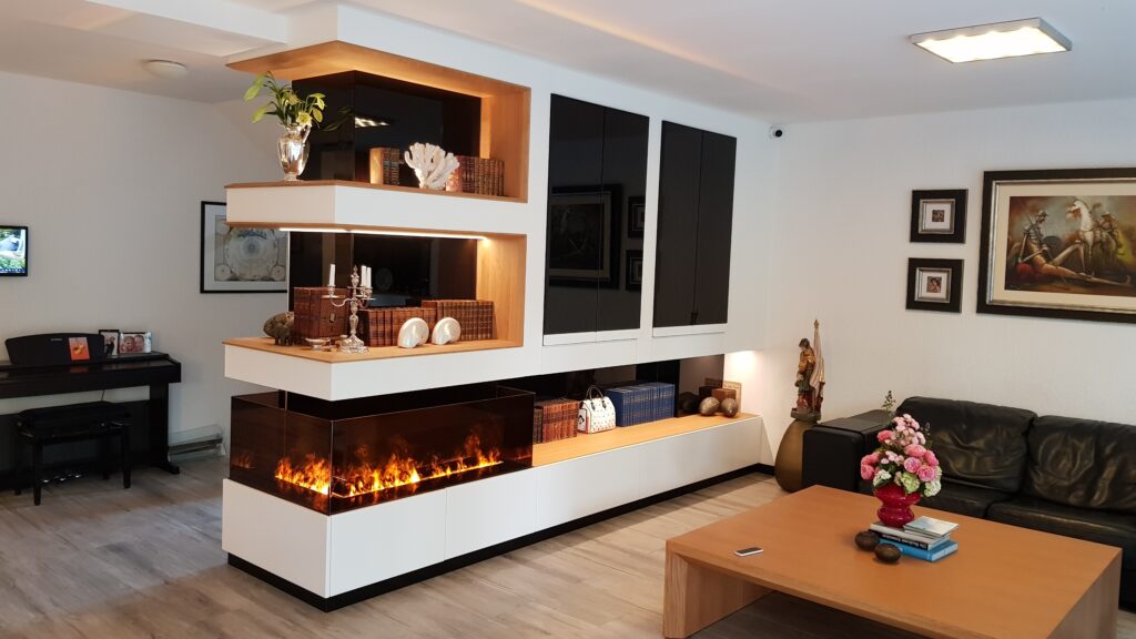 Für ein Effektfeuer mit Wasserdampf will der Kunde eine ganze Schrankwand ausgebaut bekommen, an der eine Vitrine hängt. Diese soll ebenfalls integriert werden.Das Ergebnis ist eine multifunktionale Schrankwand mit Effektfeuer über Eck!